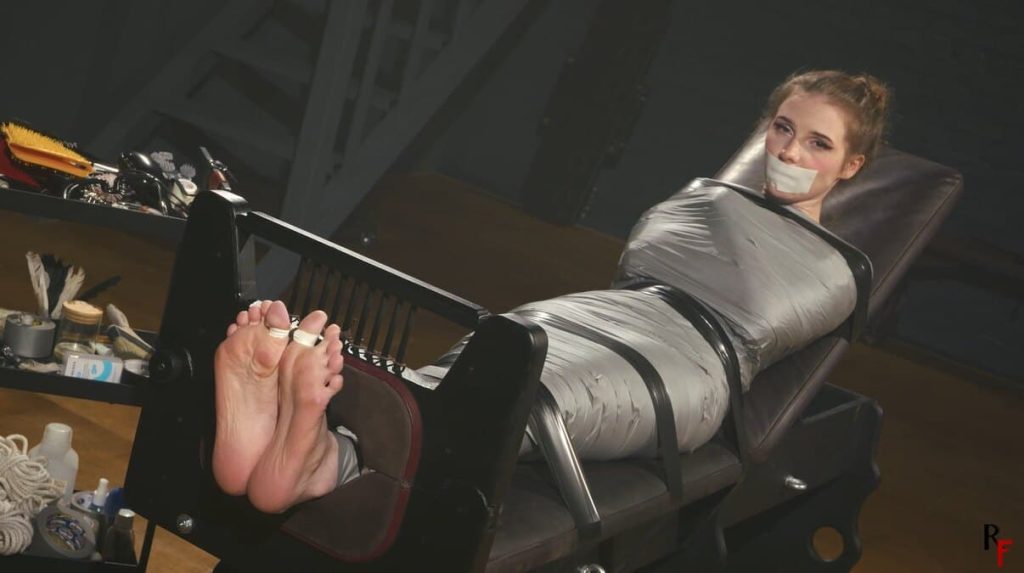 可爱的梅洛西被紧紧地裹在长凳上的灰色胶带上。只有她的头和她美丽的光脚暴露在外。她的脚踝被锁在足枷里,大脚趾绑在一起,一条微泡沫胶带封住了她的嘴唇。她敏感的脚底成为会议的主要焦点。我先用羽毛和手指轻轻地戏弄她,然后慷慨地给她的脚底上油,继续用电动牙刷、梳子和按摩刷挠痒痒。